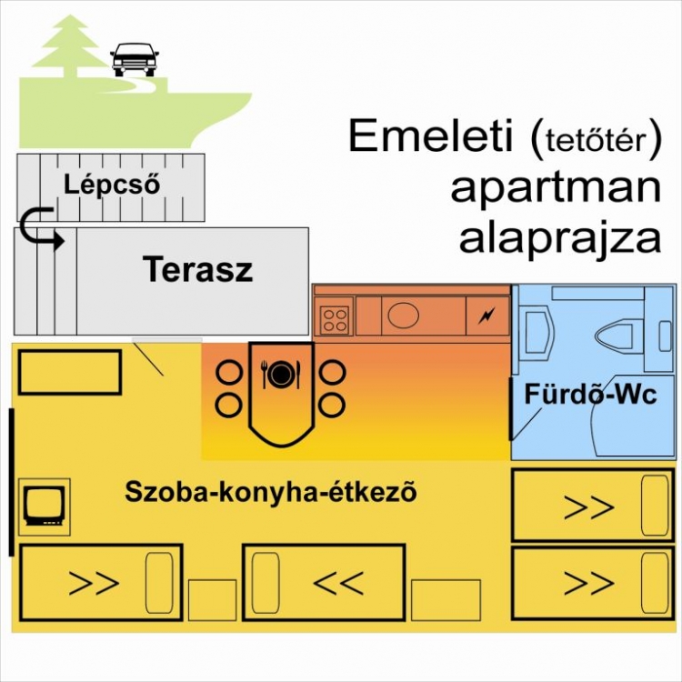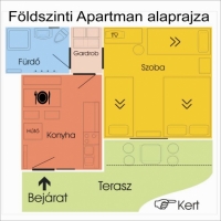 1-es földszinti apartman:saját terasz, szoba, nagy konyha, gardrób, fürdõszoba.